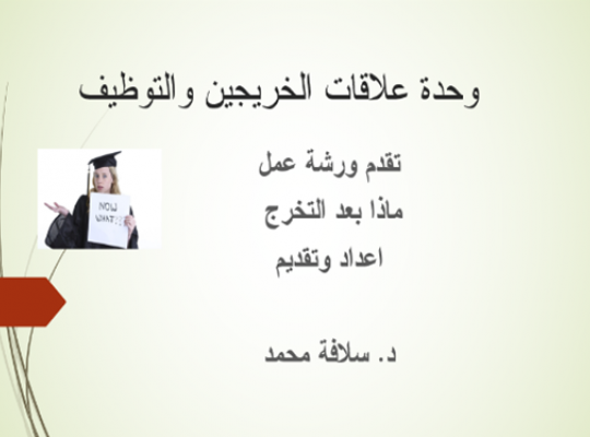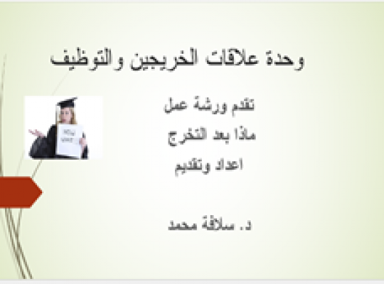 جامعة جازان: إدارة الإعلام نظمت وكالة الكلية الجامعية بالداير للشؤون الأكاديمية ممثلة في وحدة علاقات الخريجين والتوظيف بالتعاون مع وحدة الإرشاد النفسي ضمن برامج خطة تدريب الخريجين ورشة عمل بعنوان (ماذا بعد التخرج) من إعداد وتقديم سلافة محمد أحمد عضو