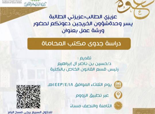 جامعة جازان: إدارة الإعلام في إطار خطة وحدة شؤون الخريجين في كلية الشريعة والقانون للمتوقع تخرجهم في العام الجامعي 1443هـ؛ قدم الدكتور حسين بن ناصر آل إبراهيم رئيس قسم القانون الخاص، ورشة عمل عن دراسة جدوى مكتب محاماة، على منصة زوم أكد فيها على أهمية