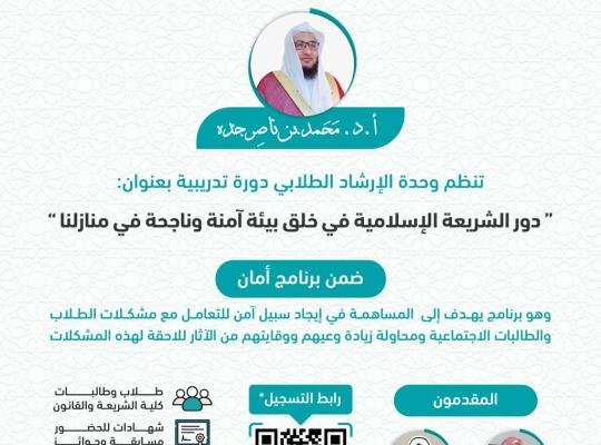 نفذت وحدة الإرشاد الطلابي بكلية الشريعة والقانون دورة تدريبية بعنوان دور الشريعة في خلق بيئة ناجحة وآمنة في منازلنا ضمن برنامج أمان الذي يساهم في إيجاد سبيل آمن للتعامل مع مشكلات الطلاب والطالبات الاجتماعية ووقايتهم من آثار هذه المشكلات وهو أحد محاور