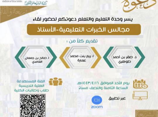 نظمت وحدة التعليم والتعلم بكلية الشريعة والقانون مجلسًا علميًّا، يهدف إلى عرض إبداعات عدد من أعضاء هيئة التدريس في كلية الشريعة والقانون في استراتيجيات التدريس، ونقْل هذه الإبداعات إلى أعضاء هيئة التدريس الآخرين، لإيجاد بيئة شاملة ومتكاملة تطبق