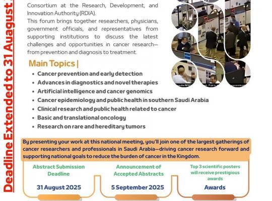 أعلنت اللجنة العلمية لملتقى جامعة جازان لأبحاث السرطان، الذي يُقام برعاية صاحب السمو الملكي الأمير محمد بن عبدالعزيز بن محمد بن عبدالعزيز، أمير منطقة جازان، عن تمديد فترة استقبال الملخصات البحثية حتى 31 أغسطس 2025م، استجابةً لرغبة العديد من الباحثين،