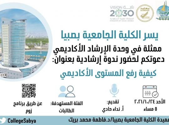 نظمت الكلية الجامعية بصبيا متمثلةً بوحدة الإرشاد الأكاديمي ندوة إرشادية بعنوان ” كيفية رفع المستوى الأكاديمي ” يوم الأحد بتاريخ 24/10/2021 قدمتها أ. نداء عبدالعزيز حادي عبر تطبيق الزوم مستهدفة الطالبات وقد شهدت الندوة حضور عدد من الطالبات ومنسوبات