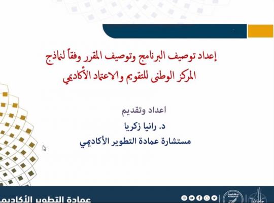 جامعة جازان: إدارة الإعلام في إطار حرص عمادة التطوير الأكاديمي على نشر ثقافة الجودة بين منسوبي البرامج الأكاديمية، نظمت وحدة التدريب بالعمادة ورشة عمل بعنوان " إعداد توصيف البرنامج المقرر وفقاً لنماذج المركز الوطني للتقويم والاعتماد الاكاديمي NCAAA""