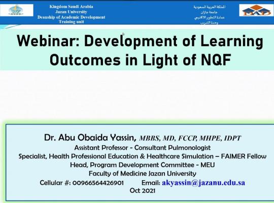 جامعة جازان: إدارة الإعلام نفذت عمادة التطوير الأكاديمي ورشة عمل "صياغة مخرجات التعلم " بواقع اربع ساعات تدريبية باستخدام تقنية الاتصال عن بعد "زووم" لعدد 168 عضو هيئة تدريس الجامعة قام بتقديم الورشة الدكتور أبو عبيدة ياسين الاستشاري بعمادة التطوير