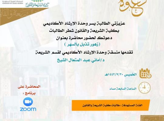 نفذت وحدة الإرشاد الأكاديمي بكلية الشريعة والقانون (شطر الطالبات) محاضرة بعنوان (زهور تذبل بالسهر) قدمتها منسقة وحدة الإرشاد الأكاديمي و عضو هيئة التدريس بقسم الشريعة هذا وقد اشتملت المحاضرة على عدة محاور منها، النوم ومراحله العمرية، واضطرابات النوم