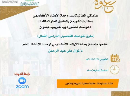 تحت رعاية فضيلة وكيلة الكلية الدكتورة زكرية بنت أحمد غلفان زكري نفذت وحدة الإرشاد الأكاديمي بكلية الشريعة والقانون شطر الطالبات على منصة الزوم دورة تدريبية بعنوان طرق تقودك للتحصيل الدراسي الفعال " وذلك يوم الخميس 7/27/ 1442 هـ الساعة 7مساء قدمتها