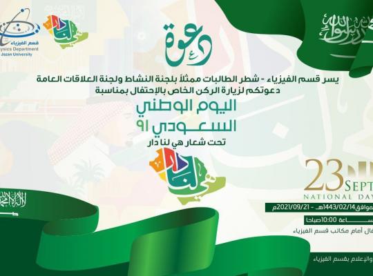 تحت شعار "هي لنا دار" اقام قسم الفيزياء-شطر الطالبات ممثلا بلجنة النشاط و لجنة العلاقات العامة ركن خاص للإحتفال بمناسبة العيد الوطني السعودي 91. اقيمة هذه الفاعلية يوم الثلاثاء الموافق 1443/2/14هـ الموافق 2021/9/21 في تمام الساعة 10 صباحا امام مكاتب