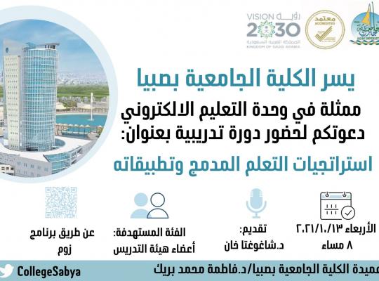 نظمت الكلية الجامعية بصبيا متمثلةً بوحدة التعليم الالكتروني دورة تدريبية بعنوان ” استراتيجيات التعلم المدمج وتطبيقاته ” يوم الأربعاء بتاريخ 7/3/1443 قدمتها د. شاغوفتا خان عبر تطبيق الزوم حيث تستهدف هذه الفعالية أعضاء هيئة التدريس وقد شهدت الدورة حضور