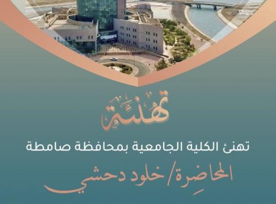 تهنئ الكلية الجامعية بمحافظة صامطة المحاضرة خلود دحشي بمناسبة تكليفها للقيام بمهام وكيلة الشؤون الأكاديمية بالكلية سائلين الله لها العون والتوفيق.