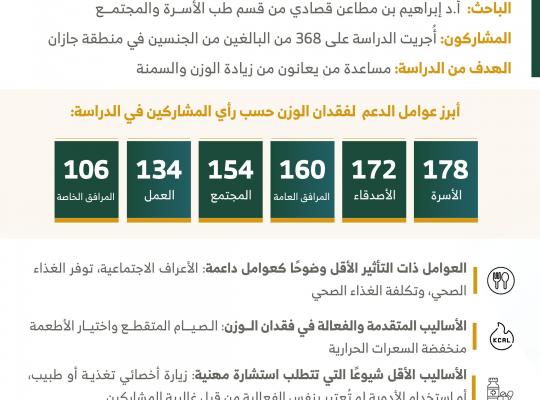 كشفت دراسة بحثية حديثة أُجريت على البالغين في منطقة جازان عن الأساليب الأكثر شيوعًا وفعالية في فقدان الوزن بين الأفراد الذين يعانون من زيادة الوزن والسمنة. قاد هذه الدراسة الأستاذ الدكتور إبراهيم بن مطاعن قصادي، الباحث بكلية الطب، قسم طب الأسرة