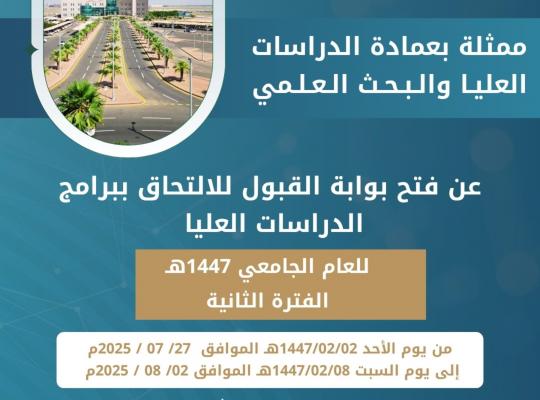 أعلنت جامعة جازان ممثلة بعمادة الدراسات العليا والبحث العلمي عن فتح بوابة القبول للالتحاق ببرامج الدراسات العليا للعام الجامعي 1447هـ للفترة الثانية وذلك خلال الفترة من يوم الأحد 2/2/1447هـ الموافق 27 يوليو 2025م، وحتى يوم السبت 8/2/1447هـ الموافق 2