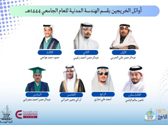 تتقدم كلية_الهندسة_بجامعة_جازان و قسم الهندسة المدنية بخالص التهاني والتبريكات لأوائل الخريجين بقسم الهندسة المدنية للعام الجامعي ١٤٤٤ هـ. سائلين الله لهم مزيدًا من التوفيق والسداد.