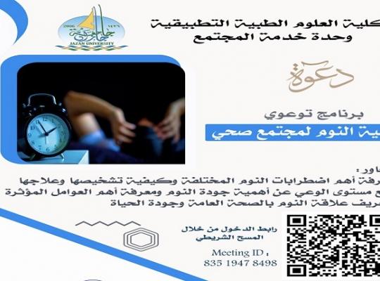 جامعة جازان: إدارة الإعلام نظمت وحدة خدمة المجتمع بكلية العلوم الطبية التطبيقية محاضرة حول أهمية جودة النوم لمجتمع صحي قدمها الدكتور محمد بن منصور الشهري عضو هيئة التدريس بقسم العلاج الطبيعي برعاية عميد الكلية الدكتور أيمن محمد مدخلي عبر برنامج زووم