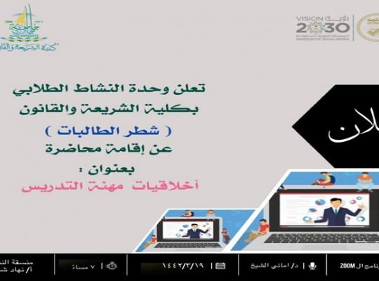 جامعة جازان: إدارة الإعلام نظمت وحدة النشاط الطلابي بكلية الشريعة والقانون فعالية بعنوان أخلاقيات مهنة التدريس والبحث العلمي للأعضاء بالكلية قامت بتنفيذها الدكتورة أماني عبد المتعال الشيخ عبدالله عبر منصة الزوم بحضور عدد من أعضاء هيئة الترديس. الدورة