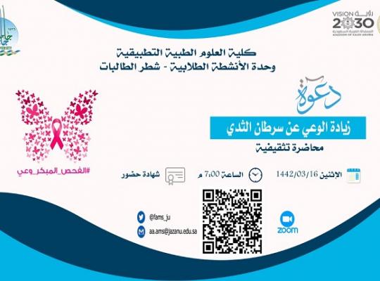جامعة جازان: إدارة الإعلام نظمت وحدة الانشطة الطلابية بكلية العلوم الطبية التطبيقية محاضرة بعنوان ((زيادة الوعي بسرطان الثدي)) والتي تأتي ضمن خطة الوحدة المعتمدة قدمتها المحاضرة عزة القرني بحضور 75 طالبة. افتتحت المحاضرة وكيلة الكلية د. نوف حسين ابو
