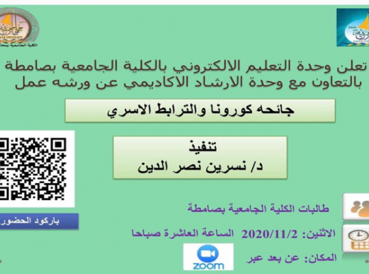 جامعة جازان: إدارة الإعلام نظمت وحدة التعليم الإلكتروني في الكلية الجامعية بصامطة بالتعاون مع وحدة الإرشاد الأكاديمي ورشة عمل بعنوان جائحة كورونا والترابط الأسري من تنفيذ د. نسرين نصر الدين استهدفت طالبات الكلية عبر منصة زووم تطرقت فيها لعدة محاور