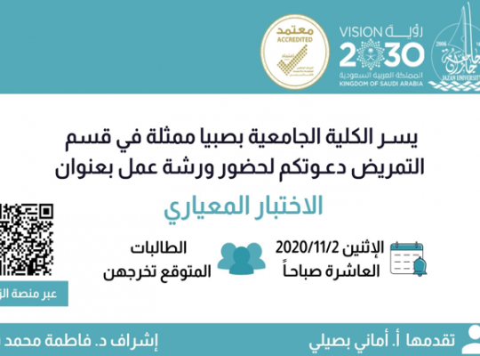 جامعة جازان: إدارة الإعلام رعت د. فاطمة بنت محمد بريك المشرفة على الكلية الجامعية بصبيا ورشة بعنوان ” الاختبار المعياري” قدمتها الأستاذة أماني بصيلي عبر منصة الزوم ، و ذلك ضمن إطار تهيئة الطالبات لدخول الاختبارات المعيارية التي أقرتها جامعة جازان،