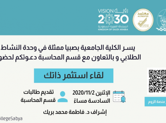 جامعة جازان: إدارة الإعلام أقامت وحدة النشاط الطلابي مُمثلةً في قسم المحاسبة لقاءً بعنوان ” استثمر ذاتك ” عبر منصة الزوم برعاية المشرفة على الكلية الجامعية بصبيا د. فاطمة بنت محمد بريك، وبحضور عدد من أعضاء هيئة التدريس والطالبات. بدء اللقاء بمقدمة