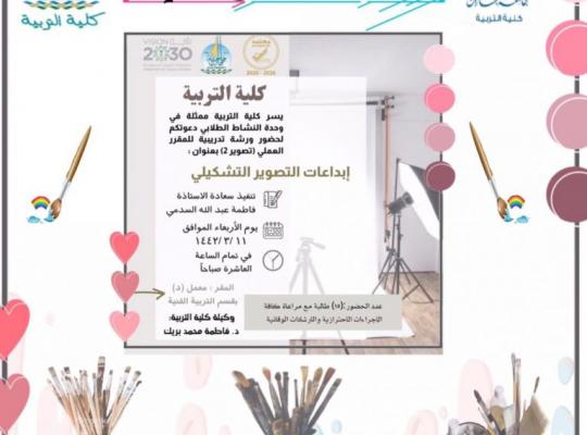 جامعة جازان: إدارة الإعلام أقامت كلية التربية ممثلة في وحدة النشاط الطلابي بالتعاون مع وحدة العلاقات العامة ورشة تدريبية بعنوان( إبداعات التصوير الشكيلي ) للمقرر العملي نفذتها الأستاذة /فاطمة عبدالله السدمي المحاضرة بقسم التربية الفنية بحضور 15 طالبة