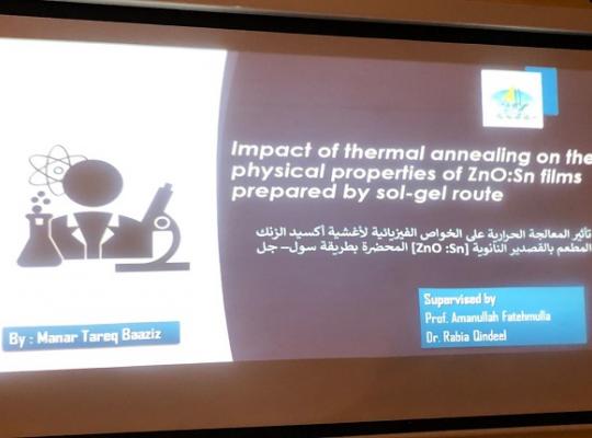 جامعة جازان: إدارة الإعلام نظمت الكلية الجامعية بصامطة ممثلةً في قسم الفيزياء دورة علمية بعنوان تأثير المعالجة الحرارية على الخواص الفيزيائية لأغشية أكسيد الزنك المطعم بالقصدير النانوية المحضرة بطريقة سول-جل من إعداد وتنفيذ أ. منار باعزيز حضرها عدد