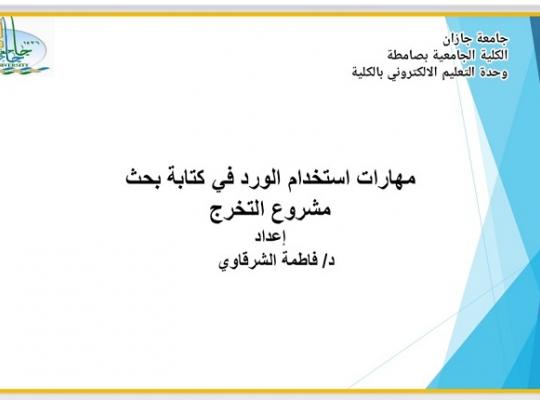 جامعة جازان: إدارة الإعلام نظمت وحدة التعليم الإلكتروني في الكلية الجامعية بصامطة وبالتعاون مع قسم الفيزياء ورشة عمل بعنوان مهارات الورد واستخدامه في كتابة بحث مشروع التخرج من تنفيذ د. فاطمة الشرقاوي استهدفت طالبات المستوى الثامن. بدأت الورشة بمقدمة