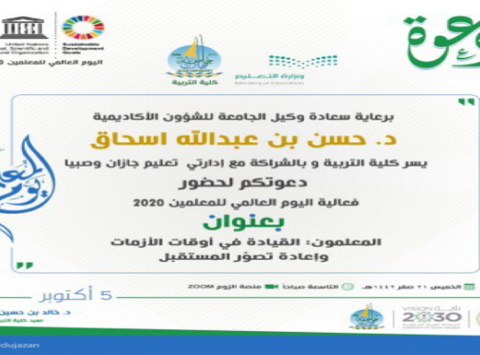 جامعة جازان: إدارة الإعلام برعاية وكيل الجامعة للشؤون الأكاديمية الدكتور حسن بن عبدالله إسحاق، عقدت كلية التربية لقاء بعنوان المعلمون: القيادة في أوقات الأزمات وإعادة تصور المستقبل وذلك بتقنية الاتصال المرئي “zoom”، ضمن سلسلة اللقاءات التي نفذتها