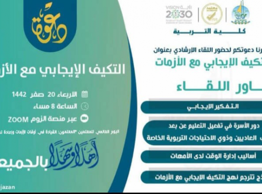جامعة جازان: إدارة الإعلام أقامت كلية التربية بجامعة جازان لقاءً إرشادياً بعنوان “التكيف الإيجابي مع الأزمات” بمشاركة وكيل الجامعة للشؤون الأكاديمية الدكتور حسن بن عبدالله إسحاق مساء الأربعاء عبر تقنية الاتصال المرئي “زوم” وذلك بمناسبة اليوم العالمي