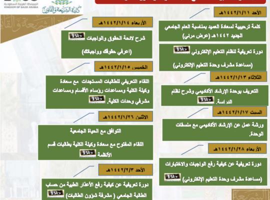 جامعة جازان: إدارة الإعلام قدمت وحدة الإرشاد الأكاديمي بكلية الشريعة والقانون شطر الطالبات برامج إرشادية افتراضية تحت إشراف وكيلة كلية الشريعة والقانون شطر الطالبات د/ زكرية أحمد غلفان زكري. وقد استهدفت هذه البرامج الطالبات المستجدات وذلك عبر منصة