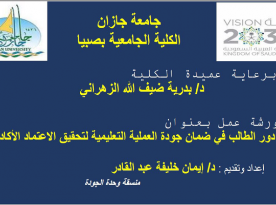 جامعة جازان: إدارة الإعلام نفذت الكلية الجامعية بصبيا ورشة عمل بعنوان ” دور الطالب في جودة العملية التعليمية لتحقيق الاعتماد الأكاديمي ” في إطار نشر ثقافة الجودة بين الطالبات تحت رعاية عميدة الكلية الدكتورة بدرية الزهراني . بدأت الورشة المقدمة من د
