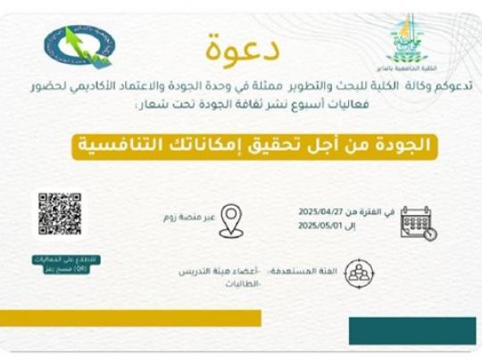 نظمت وكالة الكلية للبحث والتطوير بالكلية الجامعية بالداير ممثلة في وحدة الجودة والاعتماد الأكاديمي فعاليات أسبوع نشر ثقافة الجودة بالكلية تحت شعار "الجودة ممارسة وتميز من أجل تحقيق إمكاناتك المستقبلية". واشتملت الفعاليات على عدد من الورش التدريبة