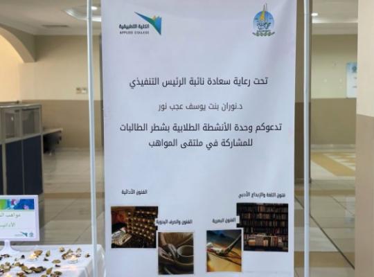 نظمت وحدة الأنشطة الطلابية بشطر الطالبات بالكلية التطبيقية ملتقى المواهب والذي يستهدف جميع الكليات داخل الجامعة، بهدف اكتشاف وتعزيز المواهب المتنوعة بين الطالبات في الكلية، وخلق منصة ملهمة تمكنهن من التعبير عن أنفسهن وإبراز قدراتهن في مختلف المجالات