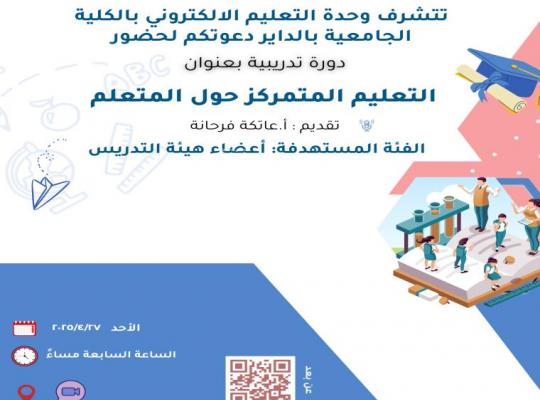 نفذت وحدة التعليم الإلكتروني في الكلية الجامعية بالداير دورة تدريبية بعنوان "التعلم المتمركز حول الطالب"، قدمتها رئيسة وحدة التعليم الإلكتروني بالكلية، الأستاذة عاتكة فرحانة. وهدفت الورشة إلى تعريف أعضاء هيئة التدريس بمفهوم ومبادئ ومزايا واستراتيجيات