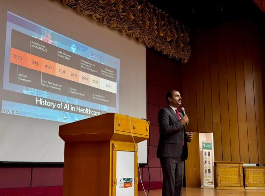 نفذت وحدة التطوير المهني المستمر بكلية طب الأسنان محاضرة بعنوان "التقنية الذكية والذكاء الاصطناعي: دورها في تشكيل مستقبل الرعاية الصحية"، قدمها كل من الدكتور شكيل أحمد والدكتورة ريما شاهين استهدفت أعضاء هيئة التدريس بالكلية. وشهدت المحاضرة الحديث حول