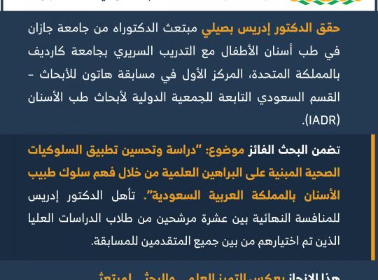 في إنجازٍ جديد يُضاف إلى إنجازات جامعة جازان، حقق الدكتور إدريس بصيلي مبتعث الدكتوراه من جامعة جازان في طب أسنان الأطفال مع التدريب السريري بجامعة كارديف بالمملكة المتحدة المركز الأول في مسابقة هاتون للأبحاث القسم السعودي التابعة للجمعية الدولية