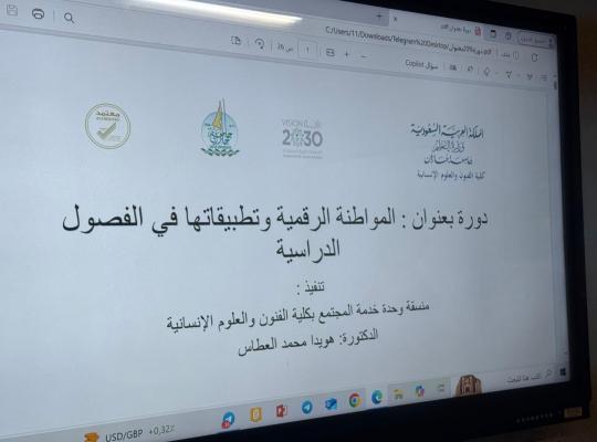 فعلت كلية الفنون والعلوم الإنسانية شطر الطالبات ممثلة في وحدة خدمة المجتمع ورشة عمل " تطبيقات المواطنة الرقمية في الفصول الدراسية " اعدتها وقدمتها الدكتورة هويدا العطاس منسقة الوحدة بالتعاون مع المدرسة الابتدائية الرابعة بجازان واستهدفت الطالبات