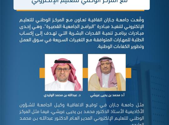 وقّعت جامعة جازان اتفاقية تعاون مع المركز الوطني للتعليم الإلكتروني لتنفيذ مبادرة “البرامج الجامعية القصيرة”، وهي إحدى مبادرات برنامج تنمية القدرات البشرية، والتي تهدف إلى إكساب الطلبة للمهارات المتوافقة مع التغيرات السريعة في سوق العمل وتطوير