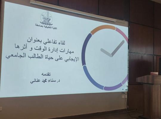 نفذت الكلية التطبيقية بمقر صامطة لقاء تفاعلي بعنوان مهارات إدارة الوقت و أثرها الإيجابي على حياة الطالب الجامعي شمل عدداً من المحاور من شأنها إعانة الطالبة على تحقيق الاستثمار الأمثل لوقتها. وشهد اللقاء عرض استراتيجيات تنظيم الوقت، والقواعد الأساسية