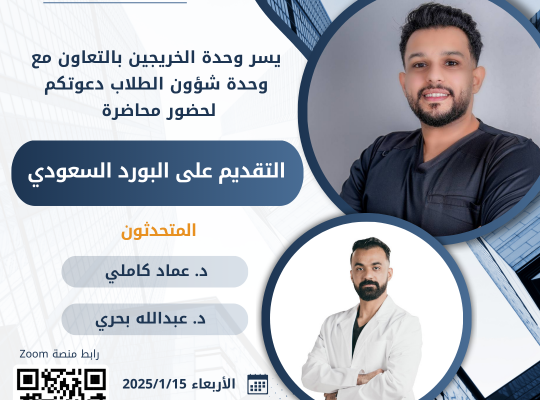 نفذت وحدة الخريجين بكلية طب الأسنان محاضرة عن طريقة التقديم على البورد السعودي، قدمها كل من الدكتور عماد كاملي والدكتور عبدالله بحري بمسرح الكلية. وتم خلال المحاضرة تناول مجموعة من المحاور الأساسية التي تهم المتقدمين، بداية بالحديث عن الخطوات اللازمة