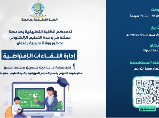 نفذت الكلية التطبيقية بصامطة ورشة عمل بعنوان إدارة اللقاءات الافتراضية وذلك ضمن سلسلة الورش التدريبية واللقاءات المعتمدة من قبل مركز التعليم الإلكتروني بالجامعة والتي تهدف إلى تعزيز المهارات التقنية لدى منسوبي ومنسوبات الجامعة. تناولت الورشة آلية