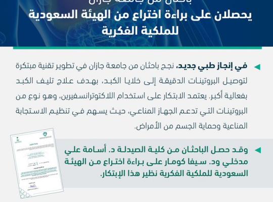 جامعة جازان: إدارة الإعلام حصل باحثان من جامعة جازان على براءة اختراع من الهيئة السعودية للملكية الفكرية بعد تطوير تقنية مبتكرة لتوصيل البروتينات الدقيقة إلى خلايا الكبد، بهدف علاج تليف الكبد بفعالية أكبر. وأوضح الدكتور أسامة مدخلي عضو هيئة التدريس