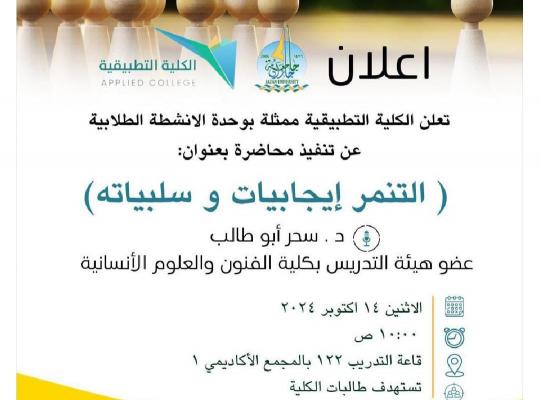جامعة جازان: إدارة الإعلام احتفالا باليوم العالمي للصحة النفسية أقامت الكلية التطبيقية شطر الطالبات عدد من الفعاليات الاحتفالية شملت محاضرة تحت عنوان "التنمر: إيجابيات وسلبيات"، وذلك ضمن خطة النشاط الطلابي قدّمتها الدكتورة سحر أبوطالب، عضو هيئة