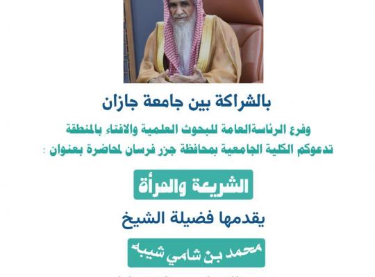 استقبلت الكلية الجامعية بفرسان بالشراكة بين جامعة جازان وفرع الرئاسة العامة للبحوث العلمية والإفتاء بمنطقة جازان فضيلة الشيخ محمد بن شامي شيبة مفوض الإفتاء بمنطقة جازان. حيث ألقى فضيلته محاضرة بعنوان: الشريعة والمرأة ودارت نقاط المحاضرة حول: (لتقليد
