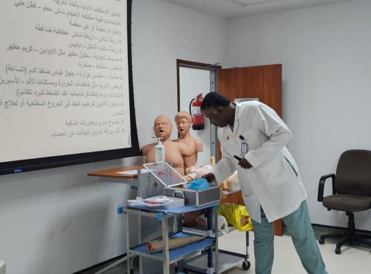 جامعة جازان: إدارة الإعلام نفذت وحدة دعم الحياة والمحاكاة السريرية بكلية الطب دورة الإسعافات الأولية والإنعاش القلبي الرئوي لموظفات المجمع الطبي الجنوبي وذلك بمعمل المهارات السريرية شطر الطالبات. بدأت الدورة بشرح من الدكتور ياسر عثمان بابكر لأساسيات