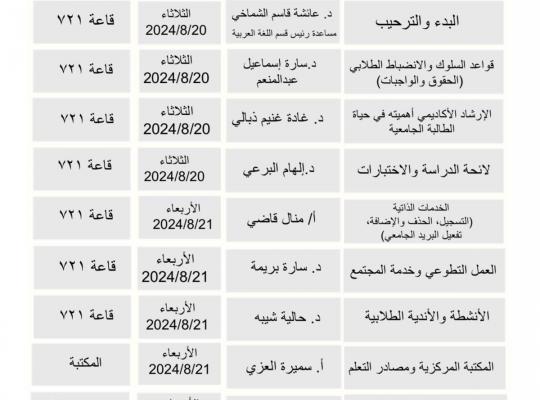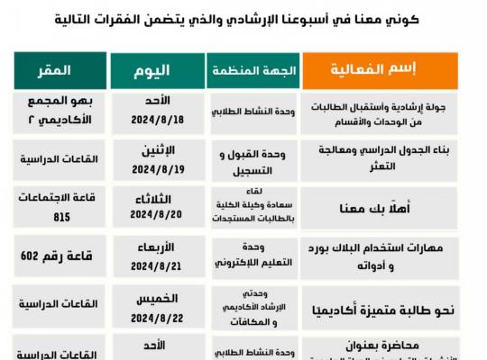 جامعة جازان: إدارة الإعلام نظمت كلية الفنون والعلوم الإنسانية شطر الطالبات مجموعة من الفعاليات والمبادرات الإرشادية التي تزامنت مع احتفاء جامعة جازان بالمستجدات للعام الجامعي 1446 هـ برعاية وكيلة الكلية الدكتورة فاطمة بريك. اشتملت الفعاليات على