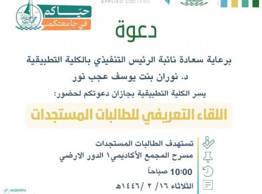 جامعة جازان: إدارة الإعلام أقامت الكلية التطبيقية بجازان اللقاء التعريفي للطالبات المستجدات للعام الدراسي 1446هـ بحضور النائبة د. نوران يوسف عجب نور ومساعدة مدير الإدارة بالكلية أ نهى أمبارك، حيث انطلقت الفعالية ابتدأ بكلمة ترحيبية وتوجيهية من منسقة
