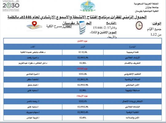 جامعة جازان: إدارة الإعلام فعلت الكلية الجامعية بجزر فرسان برنامجها الإرشادي التعريفي للطالبات المستجدات للعام الجامعي 1446هـ ـ 1447هـ برعاية عميدة الكلية الدكتورة عفاف محمد بابعير وإشراف وكيلة الكلية للشؤون الأكاديمية الدكتورة منال الحازمي وحضور