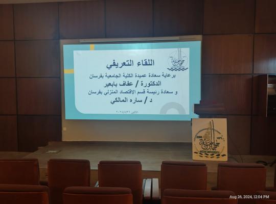 نظمت الكلية الجامعية بفرسان ممثلة في قسم الاقتصاد المنزلي لقاء تعريفياً للطالبات تحت رعاية سعادة عميدة الكلية بجزر فرسان الدكتورة / عفاف محمد بابعير، وإشراف وكيلة الكلية للشؤون الأكاديمية الدكتورة منال الحازمي ، بحضور سعادة رئيسة قسم الاقتصاد بفرسان