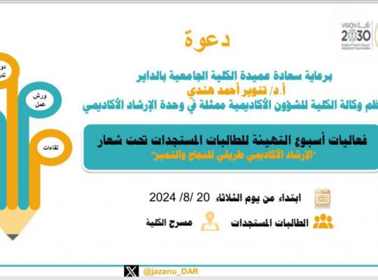 حرصاً من سعادة عميدة الكلية الجامعية بالداير على حسن تهيئة الطالبات المستجدات للاندماج في الحياة الجامعية قدمت وحدة الإرشاد الطلابي برنامج تهيئة للطالبات المستجدات للفصل الدراسي الأول للعام 1446هـ. ففي اليوم الأول الثلاثاء الموافق 16/2/1446هـ استهل