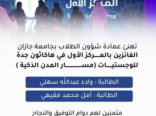 تهنىء عمادة شؤون الطلاب فريق جامعة جازان المشارك في هاكثون جامعة جدة للوجستيات، رئيسة نادي الحاسب الآلي والأمن السيبراني الطالبة ولاء سهلي وعضو النادي الطالبة أمل فقيهي من كلية الهندسة والحاسب الآلي، بمناسبة تحقيقهم المركز الأول في مسار المدن الذكية