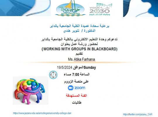 أقامت وحدة التعلم الإلكتروني في الكلية الجامعية بالدايرورشة عمل onlineبتاريخ 19/5/2024 الساعة 7:00 مساءً حول موضوع ( العمل مع المجموعات في نظام البلاك بورد) للطالبات قدمتها الدكتورة عاتيقة فرحانة. وكان الهدف من هذه الورشة هو تقديم ميزة المجموعة في